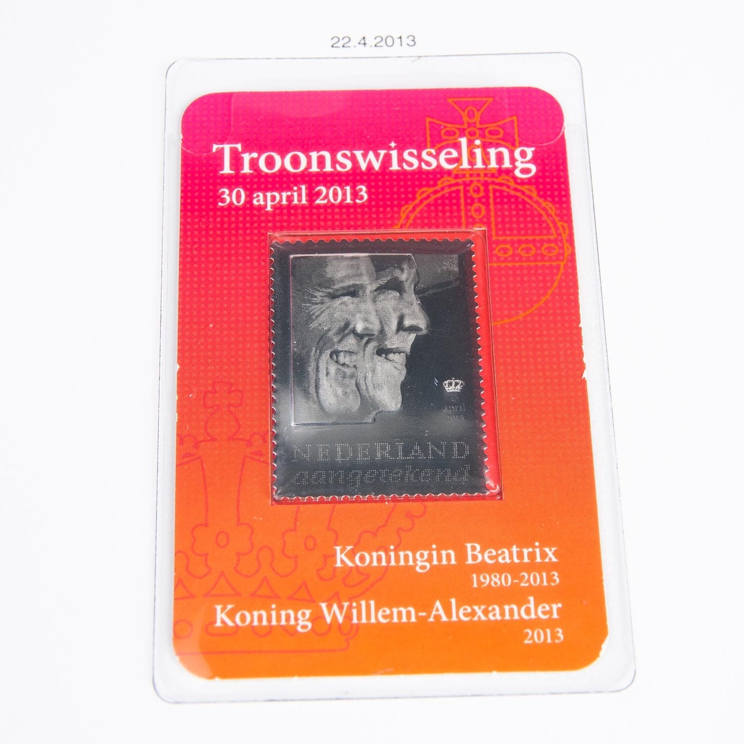 Am 22. April 2013 gab PostNL eine silberne 3D-briefmarke mit dem doppelporträt von Königin Beatrix und König Willem-Alexander mit einem einschreibeporto von 7,70 € heraus. Für diese marke wurde der basisbeilage Niederlande 2013 ein blatt hinzugefügt. Dieses blatt, 229a, ist mit einer kreditkartenhülle versehen. Auf anfrage sind diese abdeckungen jetzt auch separat erhältlich.