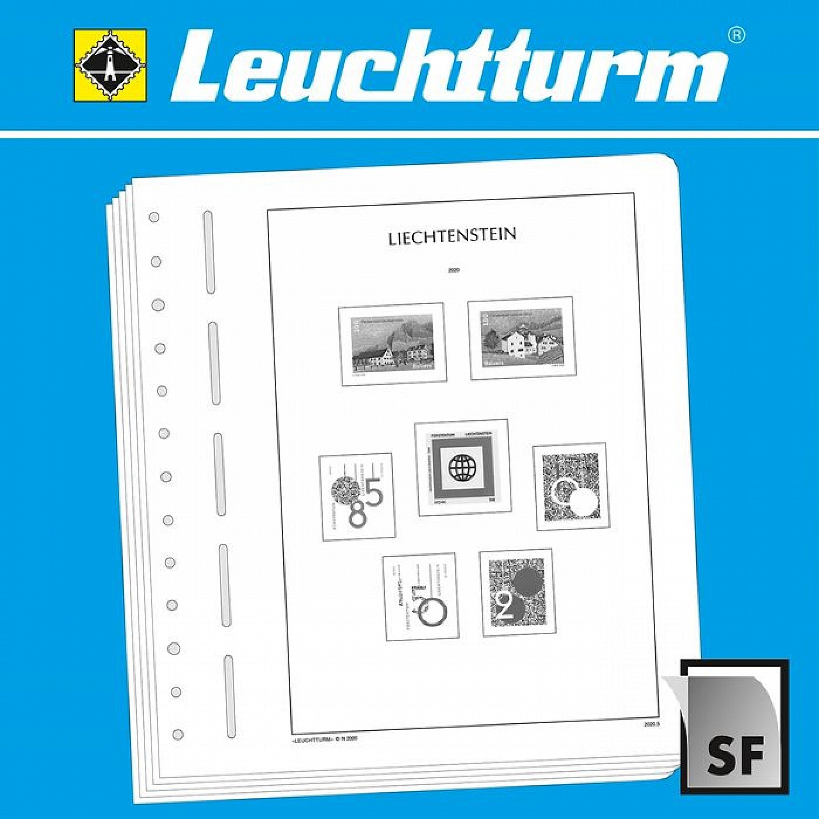 Jedes jahr erscheint die nachtrag Liechtenstein, dieses enthält die blätter für das Leuchtturm vordruckalbum. Die blätter haben SF klemleisten und eine 13-ring-perforation für die Leuchtturm-ringbinder.