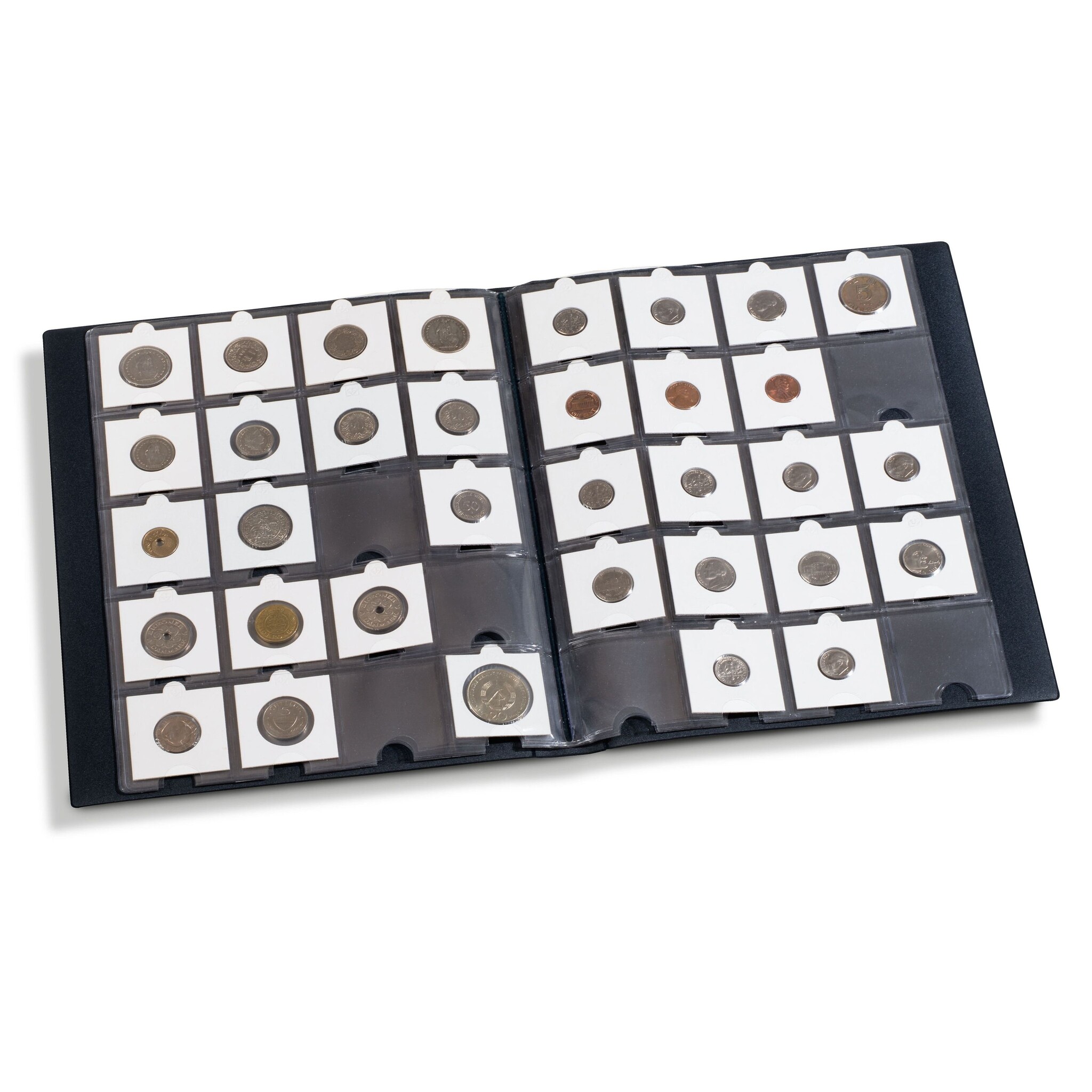 Ausgestattet mit 10 festen Einlageblättern, die für 200 Münzhalter 50x50 mm geeignet sind.