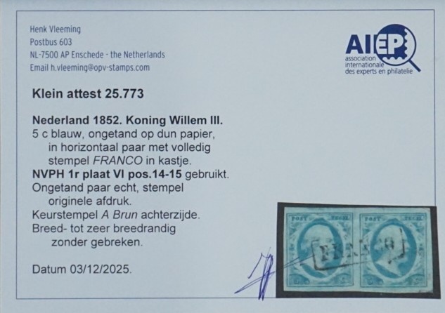 NVPH - 1, Briefmarke (Niederlande), Ausgegeben im Jahr: 1852, Gestempelt (U) - Befund - Paar - pos.14/15