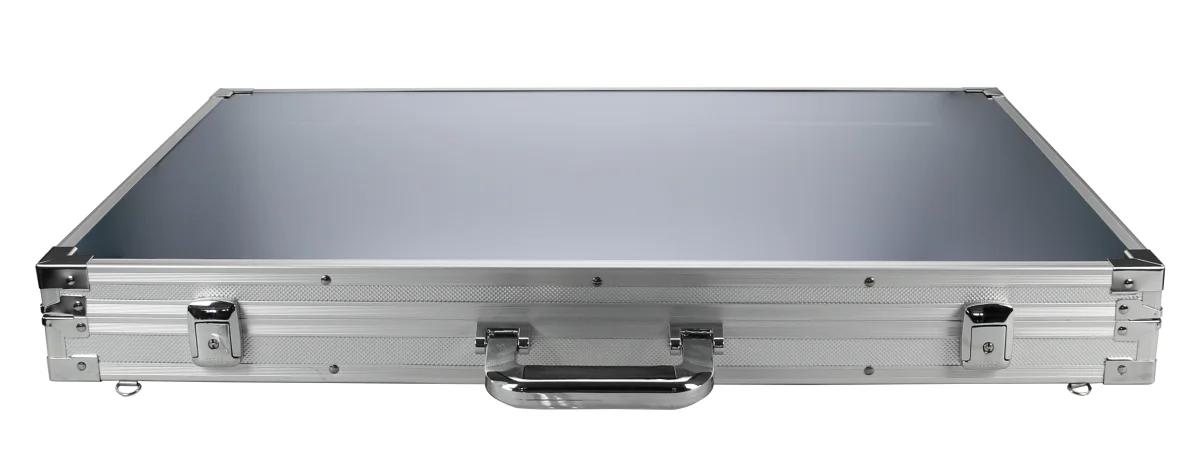 Der Aluminiumrahmen gewährleistet Stabilität und dauerhafte Zuverlässigkeit. Mit Gesamtmaßen von 700 x 500 x 80 mm ist das Display großzügig dimensioniert und vielseitig einsetzbar.