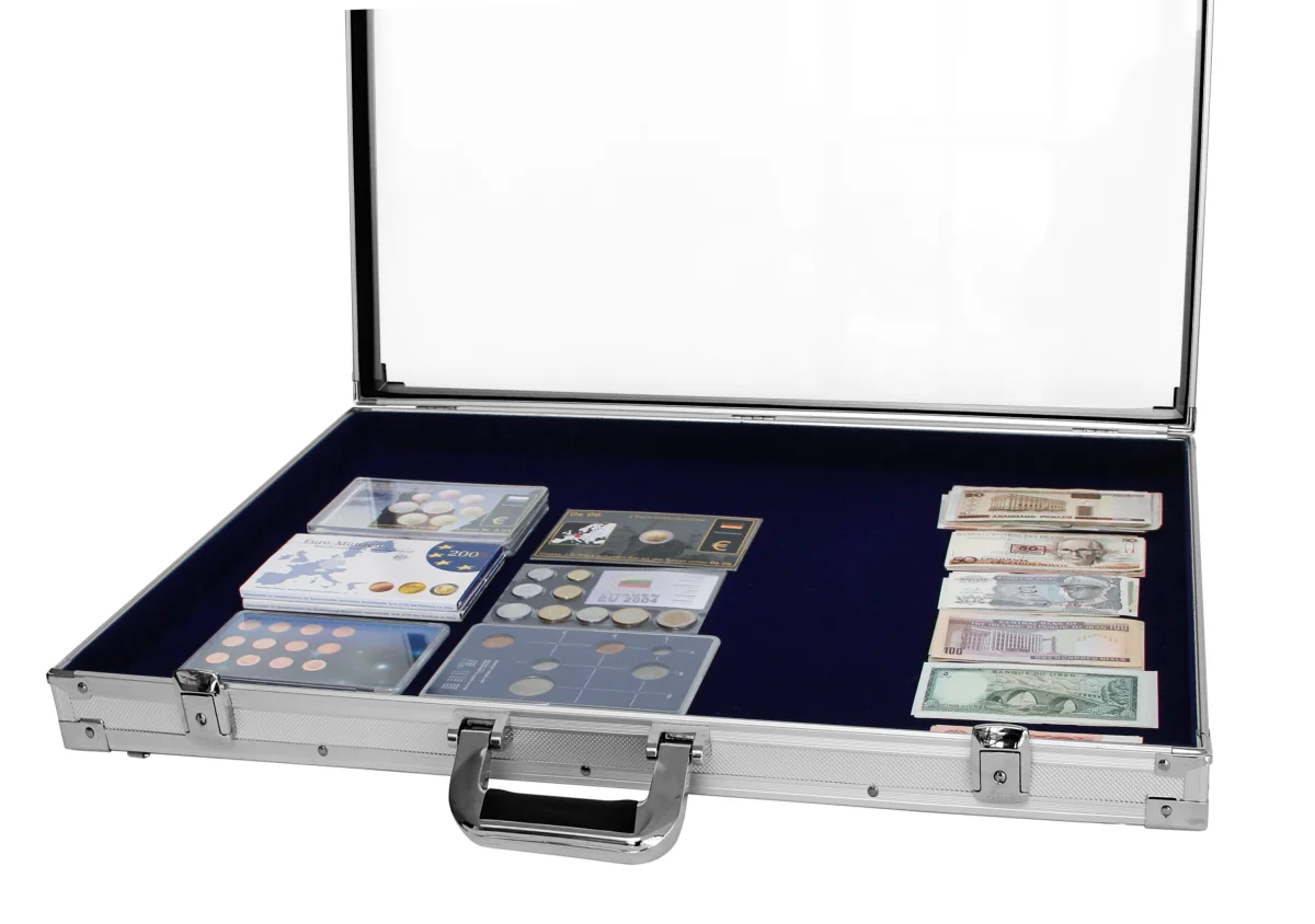 Die feste Einteilung sorgt für eine klare Präsentationsfläche. Das dunkelblaue Interieur hebt Münzen, Medaillen, Schmuck oder andere Sammlerstücke optisch hervor.