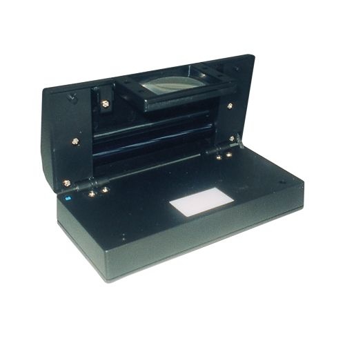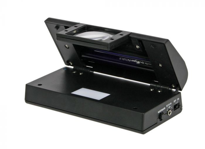 Dieser Tester kann auch als Lupe verwendet werden. Dank eines speziellen ausklappbaren Aufsatzes verfügen Sie über eine Vergrößerungslinse (2,5-fache Vergrößerung), um Details besser beobachten zu können. An der Unterseite befindet sich eine weiße LED-Leuchte zur Erkennung von Wasserzeichen. Weitere Vorteile sind das robuste schwarze Kunststoffgehäuse, das sich zusammenklappen lässt, sowie das geringe Gewicht, wodurch es sich ideal für Reisen, Messen und Ausstellungen eignet. Dieser Multitester wird mit Batterien (4 x AAA, nicht im Lieferumfang enthalten) oder einem 220-V-Netzteil betrieben (kann separat in unserem Webshop bestellt werden)