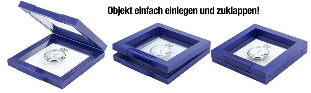 Der praktische klippverschluß erlaubt es, den Rahmen wie ein Buch vollständig auf- und zuzuklappen. Das Sammelobjekt kann jederzeit herausgenommen werden , um es gegen eine anderes Sammlerstück auszutauschen. Es wird auf eine der beiden Silikonmembran-Folien gelegt und der Rahmen anschließend geschlossen. Das Objekt ist nun von beiden Silikonmembran-Folien umschlossen und bleibt an seinem Platz. Die beiden Rahmen-Hälften werden durch einen Klippverschluss fest zusammen gehalten.