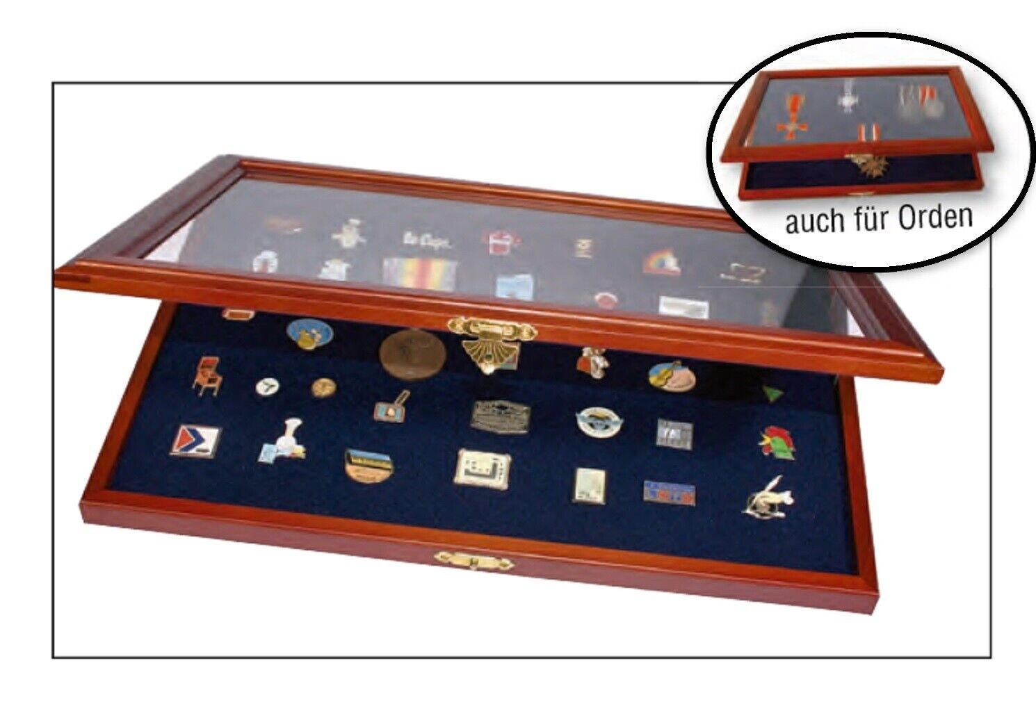 Eleganter Design-Medaillen Kassette aus mahagonifarbenem Massivholz mit einem Glasdeckel.