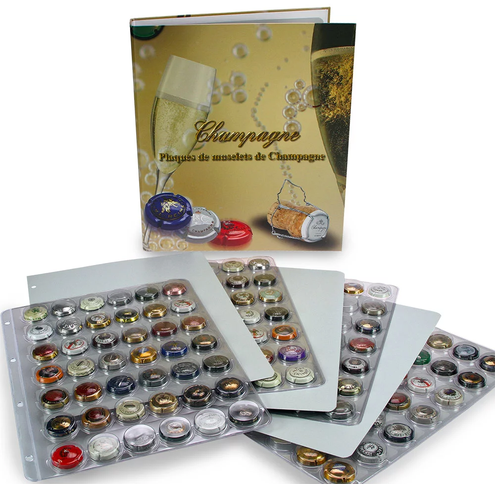 Modernes, praktisches Album zum Sammeln von Champagnerkapseln. Mit transparenten Blättern, die mit 42 Aussparungen versehen sind.