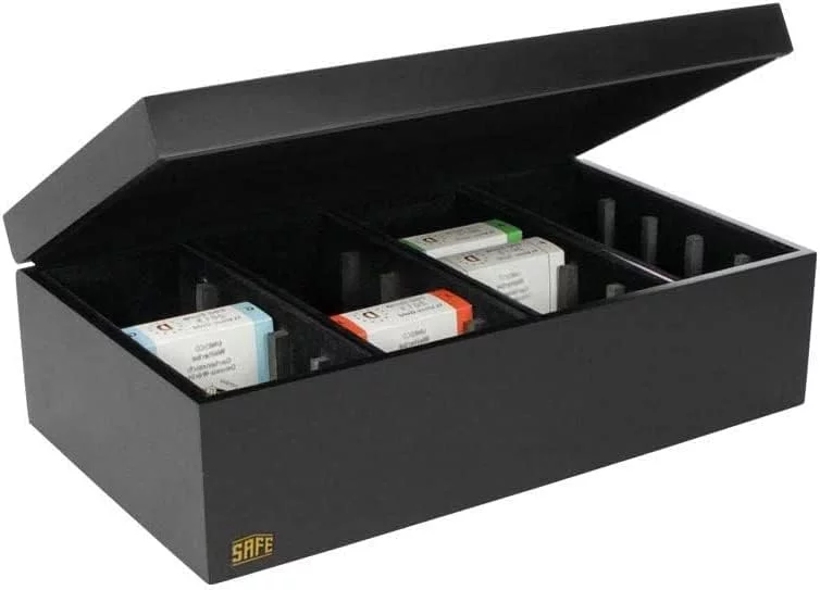 Schwarzes Velours-Innenfutter mit 20 Fächern für Münzkoffer. Geeignet für alle Münzkassetten mit maximalen Abmessungen von 70 x 70 x 27 mm. oder 2 Stück mit einer Dicke von 12 mm. z.B. Safe F.C. Serie.
