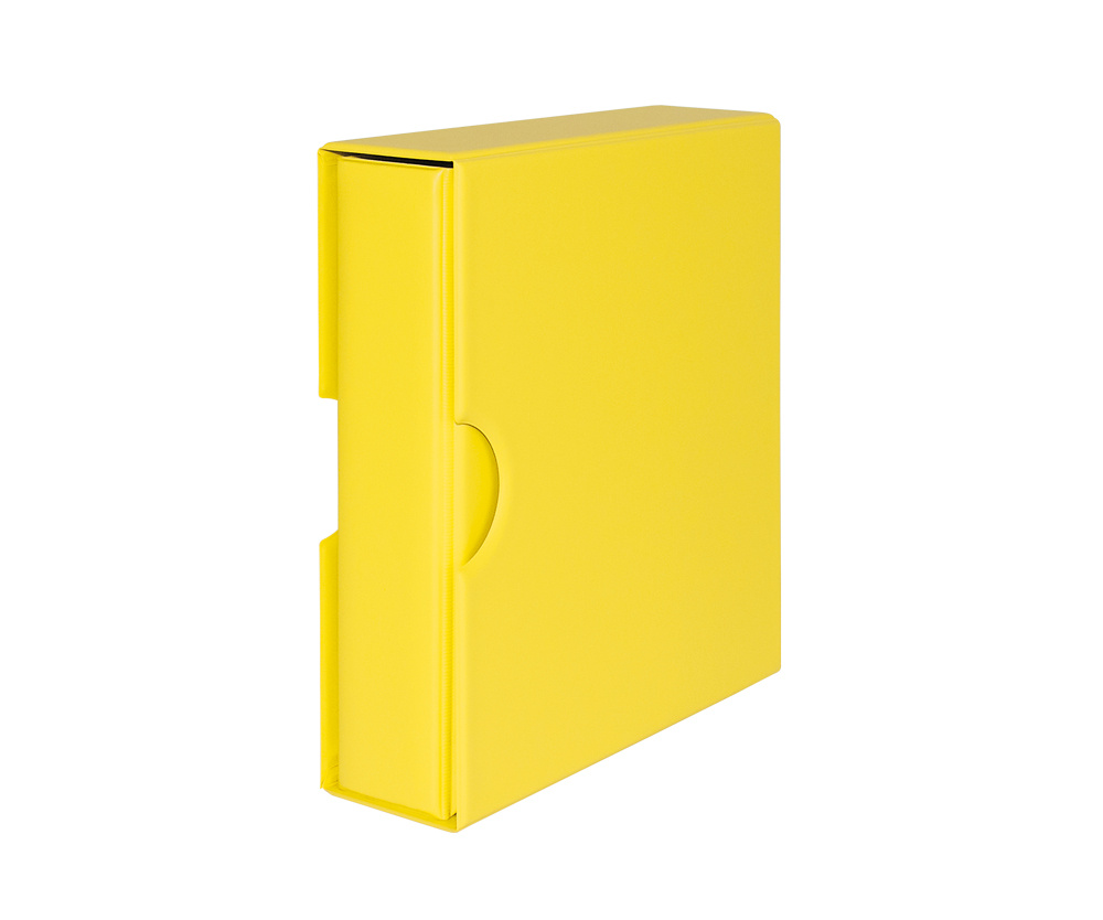 The slipcase (incl.) that comes with the ringbinder is finished completely rectilinear.