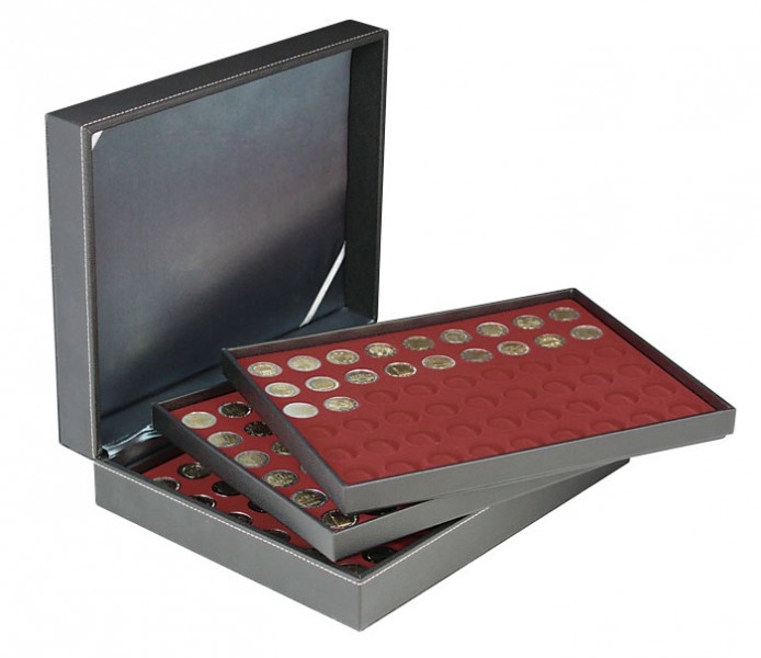 Handmade with precision and high quality - covered with a black stylish grained faux leather. The trays for the slipcases are equipped with velour inserts. The interior of the lid is equipped with an anthracite-colored cushion.
