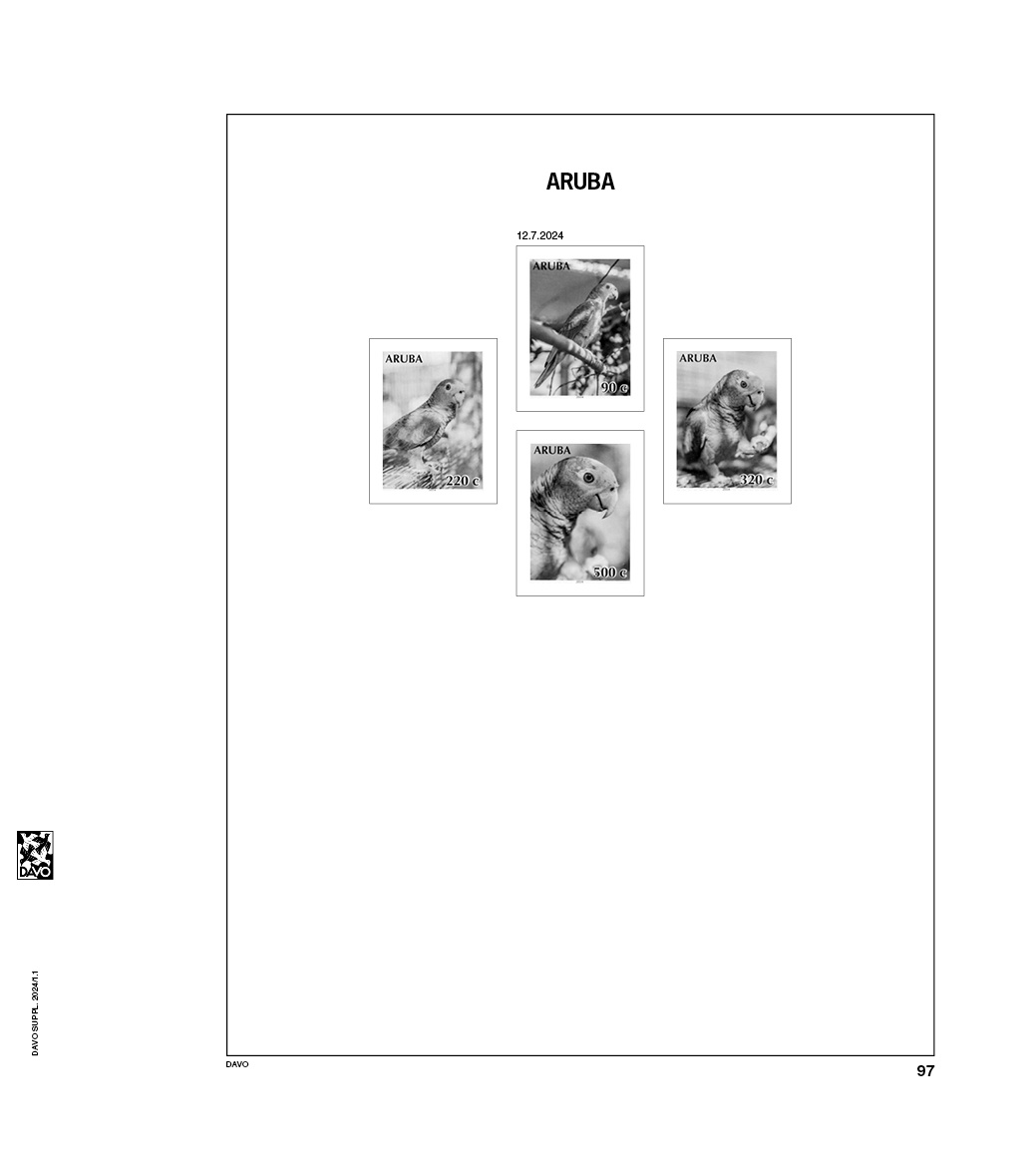 With a size of 275 x 310 mm and a 2 Holes perforation, these pre-printed sheets fit perfectly in the corresponding 2024 albums Each sheet is equipped with black border lines and image(s) in Black on sheets in the color White, e.g. stamps, miniature-sheets, stamp booklets, etc. that belong in this pre-printed album sheet. This gives you a clear overview of what you already have and what is still missing. This way, you can keep your collection organized and up to date, sorted by year or period.