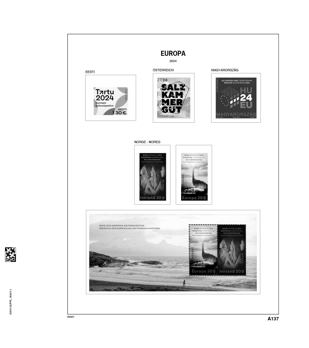 With a size of 275 x 310 mm and a 2 Holes perforation, these pre-printed sheets fit perfectly in the corresponding 2024 albums Each sheet is equipped with black border lines and image(s) in Black on sheets in the color White, e.g. stamps, miniature-sheets, stamp booklets, etc. that belong in this pre-printed album sheet. This gives you a clear overview of what you already have and what is still missing. This way, you can keep your collection organized and up to date, sorted by year or period.