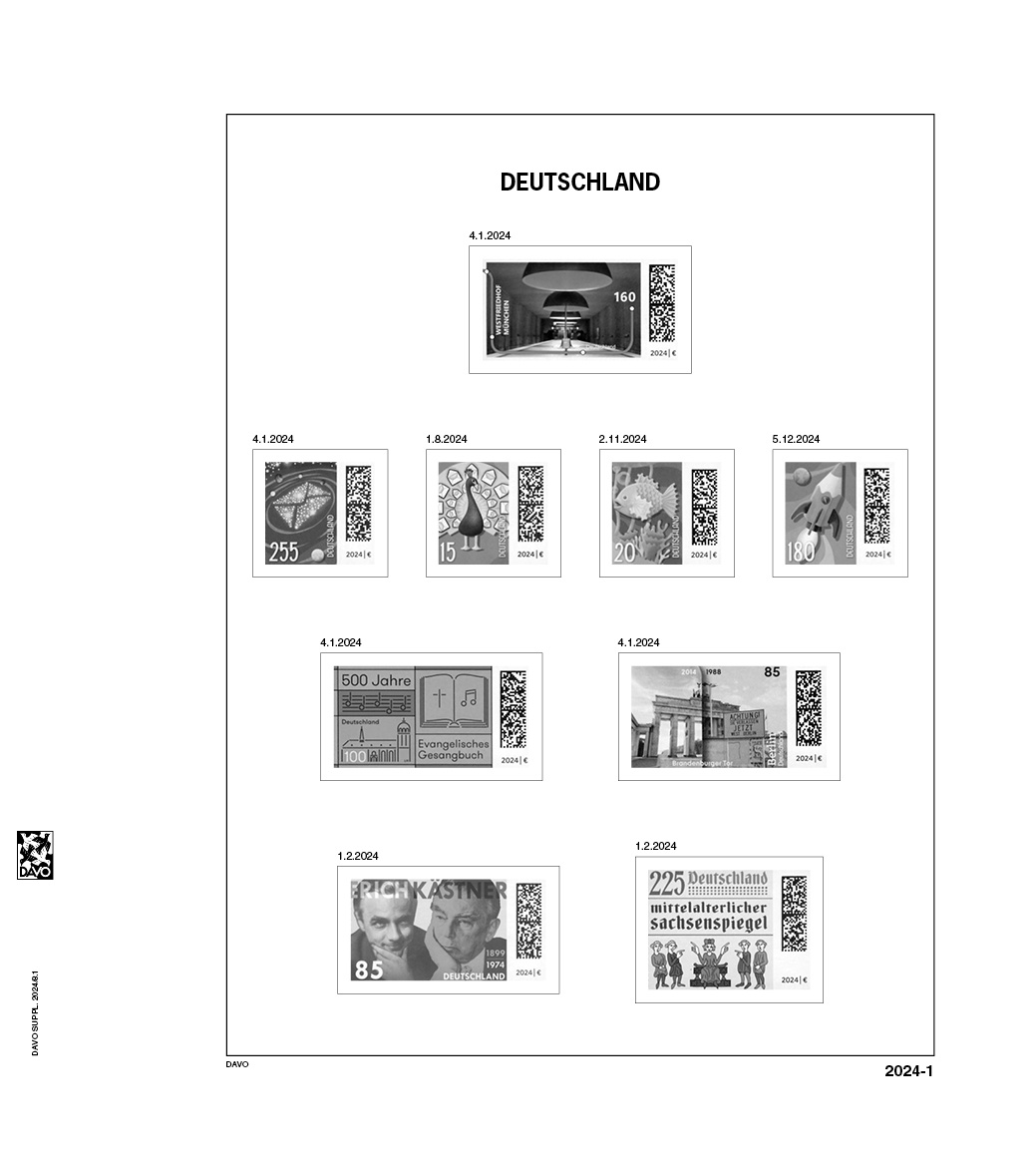 With a size of 275 x 310 mm and a 13 Rings perforation, these pre-printed sheets fit perfectly in the corresponding 2024 albums Each sheet is equipped with black border lines and image(s) in Black on sheets in the color White, e.g. stamps, miniature-sheets, stamp booklets, etc. that belong in this pre-printed album sheet. This gives you a clear overview of what you already have and what is still missing. This way, you can keep your collection organized and up to date, sorted by year or period.