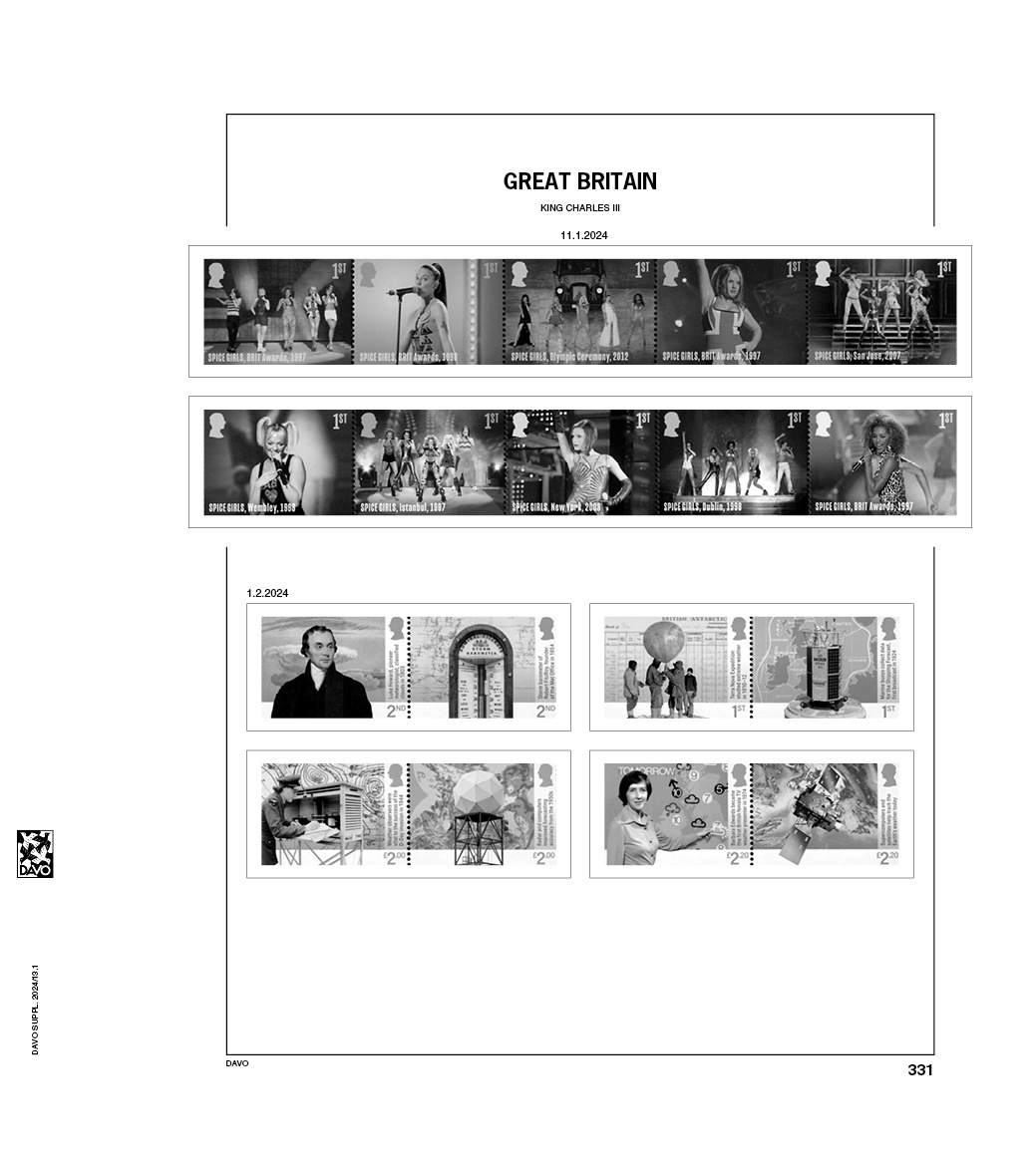 With a size of 275 x 310 mm and a 2 Holes perforation, these pre-printed sheets fit perfectly in the corresponding 2024 albums Each sheet is equipped with black border lines and image(s) in Black on sheets in the color White, e.g. stamps, miniature-sheets, stamp booklets, etc. that belong in this pre-printed album sheet. This gives you a clear overview of what you already have and what is still missing. This way, you can keep your collection organized and up to date, sorted by year or period.