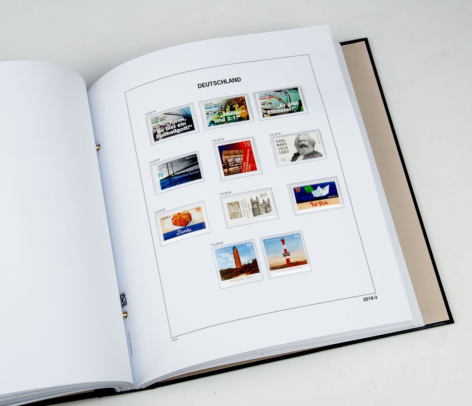 The supplements with pre-printed sheets of Davo, of the type DeLuxe, are made from particularly sturdy, wood-free and age-resistant cardboard with a weight of 170 gr/m2. These high-quality sheets are available in the color White and equipped with acid- and plasticizer-free protect your stamps, stamp booklets, miniature-sheets, etc. optimally against external influences, without obstructing the view of your collection.