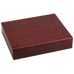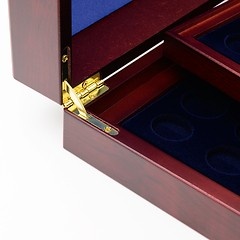 High quality coin case in mahogany wood grain and on the inside with a blue silk lining.