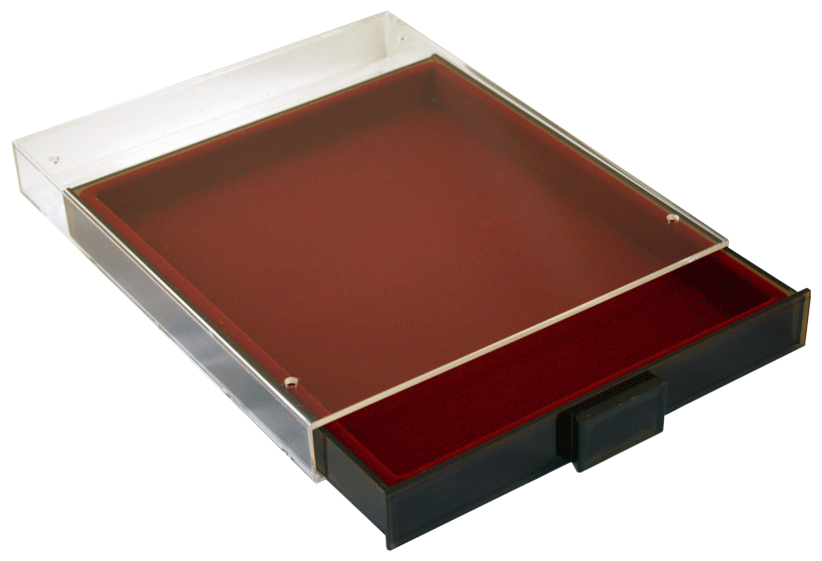Space-saving, smoky acrylic glass drawer with red velour lining. Drawers fit together like a puzzle to prevent shifting when stacked. Stackable and with angled handle for effortless drawer opening.