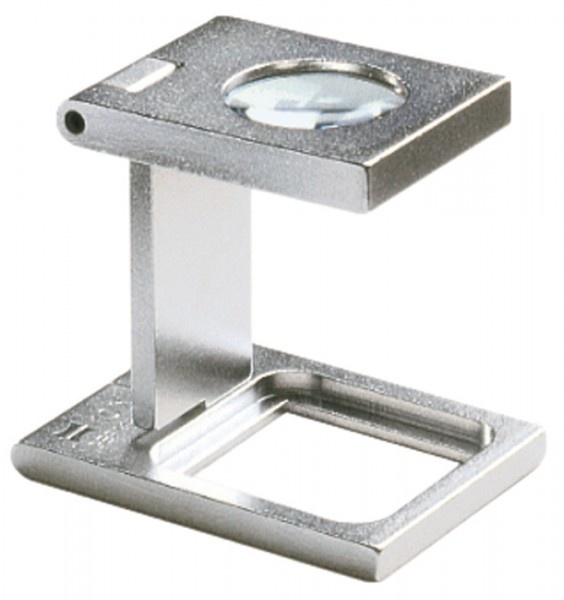 The lens is attached in a folding frame at the top, at the bottom (base) is a square recess with a scale in mm. on 2 or 4 sides so you can read the perfect size. If you fold the linen tester, the lens is safely stored away. In this way you can easily and safely transport the linen tester.