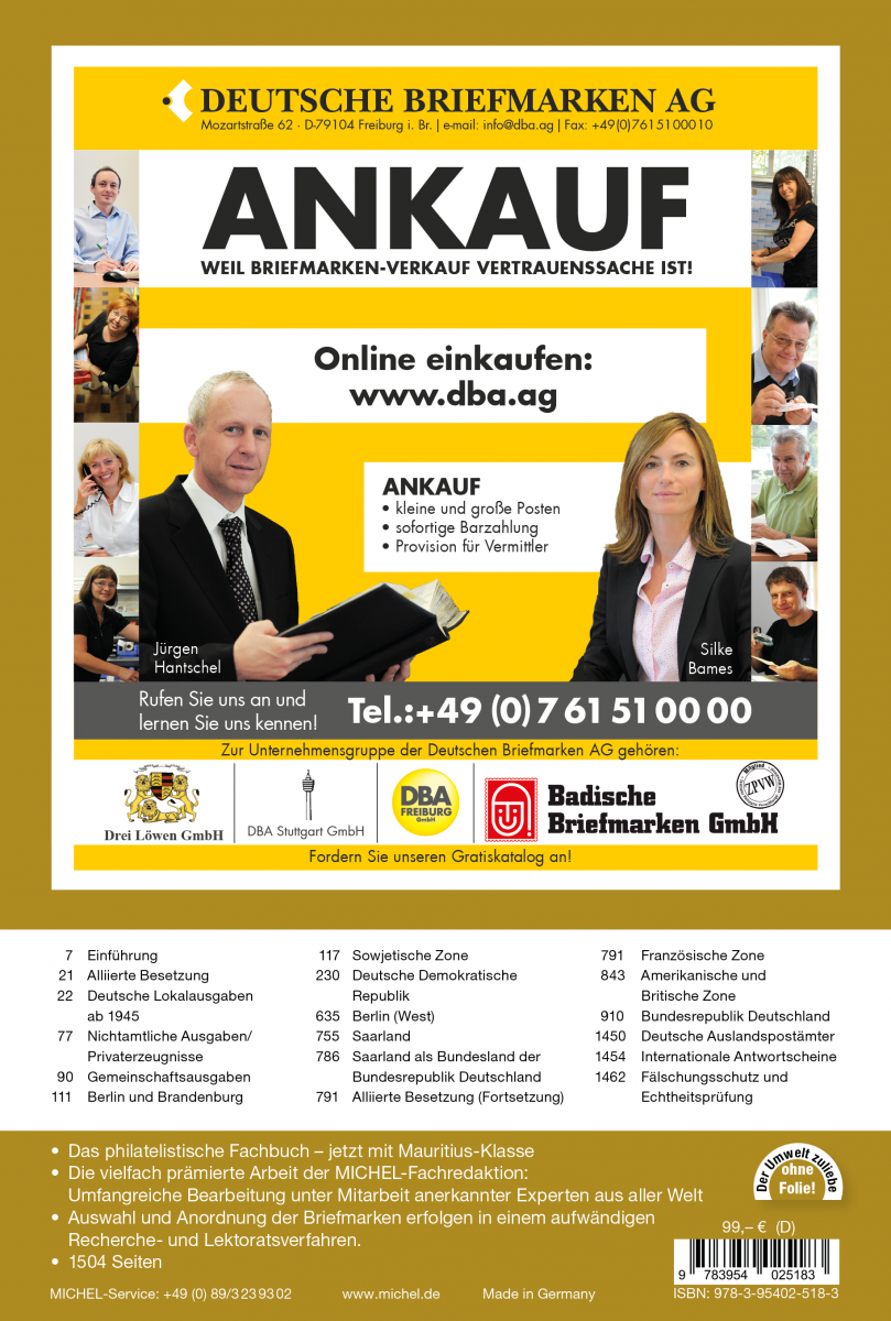 In this catalog you can find the following areas; German local issues from 1945 with official issues and private products; common issues, Berlin and Brandenburg, Soviet zone; German Democratic Republic, Berlin (West), Saarland and Saarland as a state of the BRD; French zone, American and British zones; GDR, foreign post offices, international coupons.