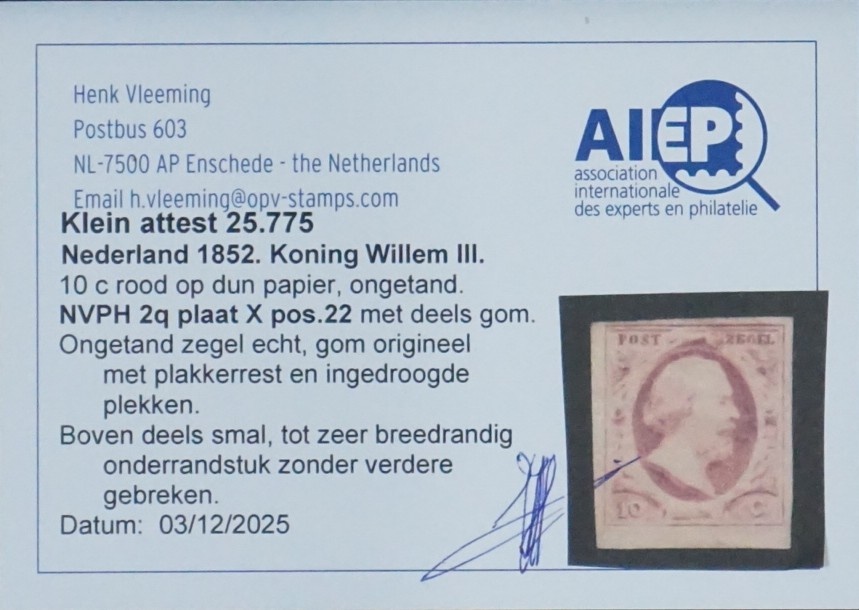 NVPH - 2, Postage stamp (Netherlands), Issued in the year: 1852, Mint Hinghed (MH) - Expert attestation -