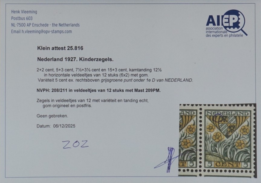 NVPH - 208-211, Postage stamps (Netherlands), Issued in the year: 1927, Mint Not Hinghed (MNH) - Plate flaw209PM - Expert attestation - Block van 12