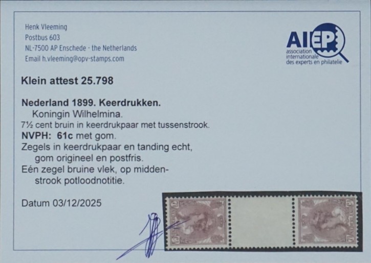 NVPH - 61c, Postage stamp (Netherlands), Issued in the years: 1899-1921, Mint Not Hinghed (MNH) - Expert attestation - Tête-bêche