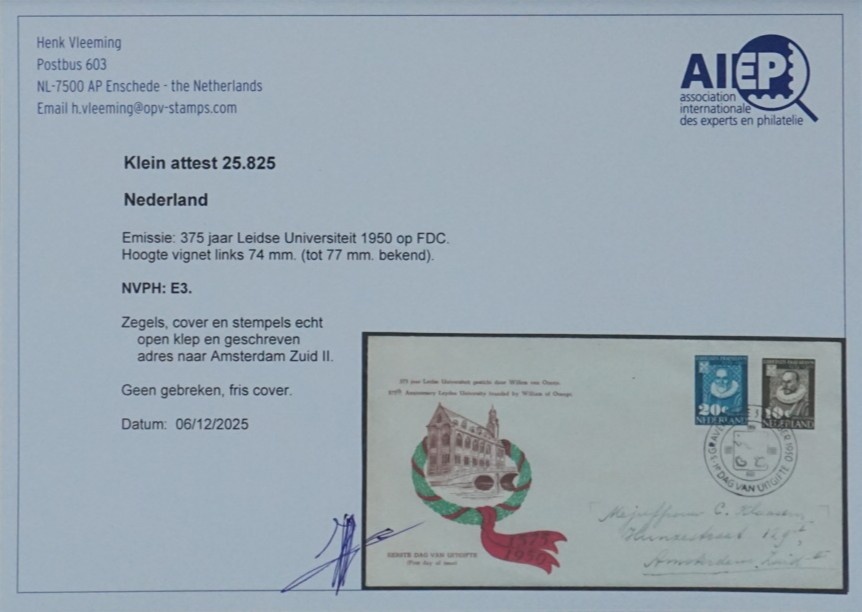 NVPH - , First Day Cover (Netherlands), Issued in the year: 1950, Addressed (A) - Expert certificate - Open flap (OF)