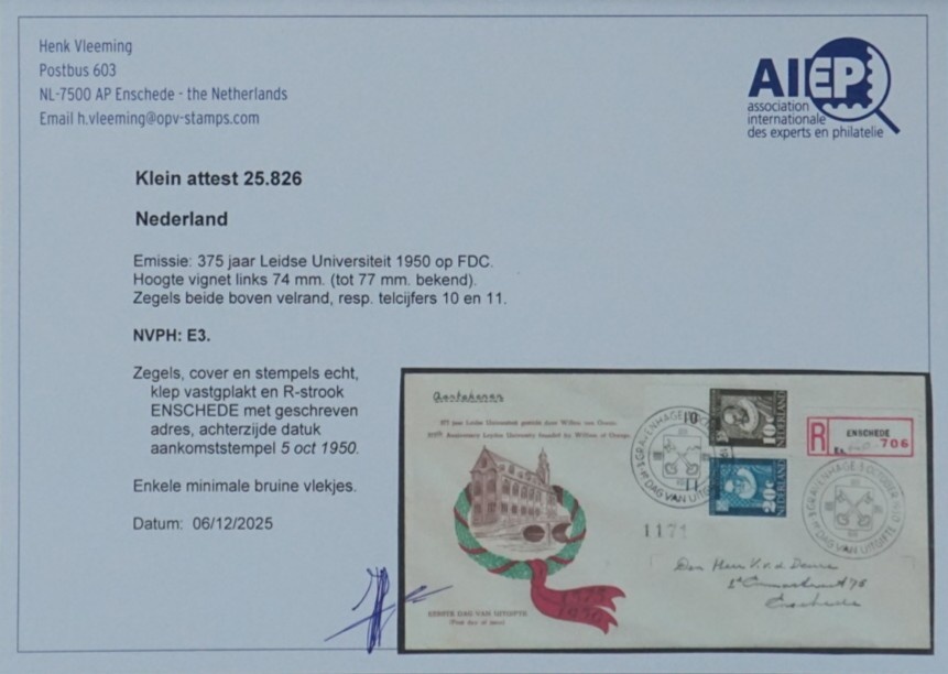 NVPH - , First Day Cover (Netherlands), Issued in the year: 1950, Addressed (A) - Expert certificate - Open flap (OF)