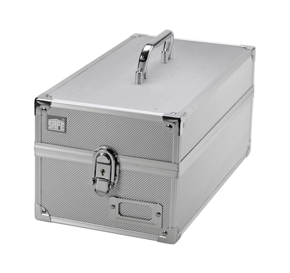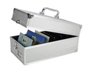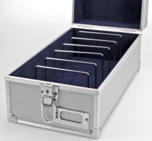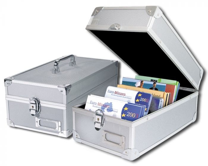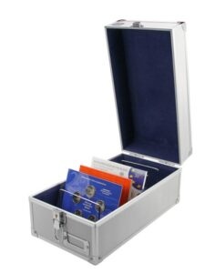 High quality aluminum coin case which has a blue lining on the inside. The case is solidly constructed and equipped with steel corner protectors. The top is completely removable. The case features lock with key and handle.