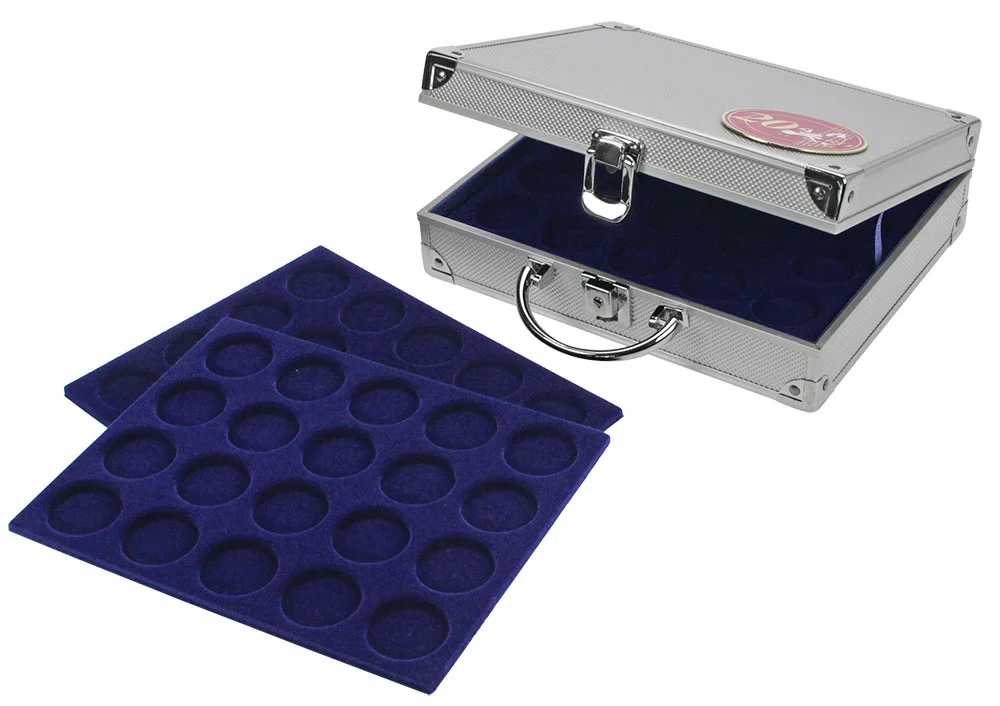 High quality aluminum coin case which has a dark blue velour lining on the inside. The case is solidly constructed and equipped with steel corner protectors. At the top a luxury emblem. The case can be closed with 2 locks with key.