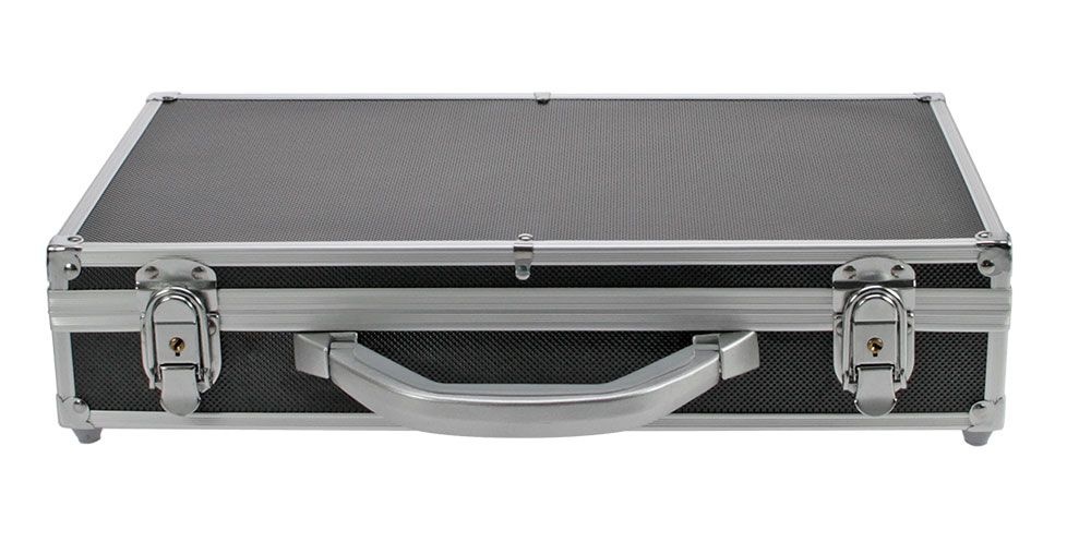 High quality coin case in diamond black and lined on the inside with dark blue velour. The case is solid and equipped with steel corner protectors. The case can be closed with 2 locks with key.