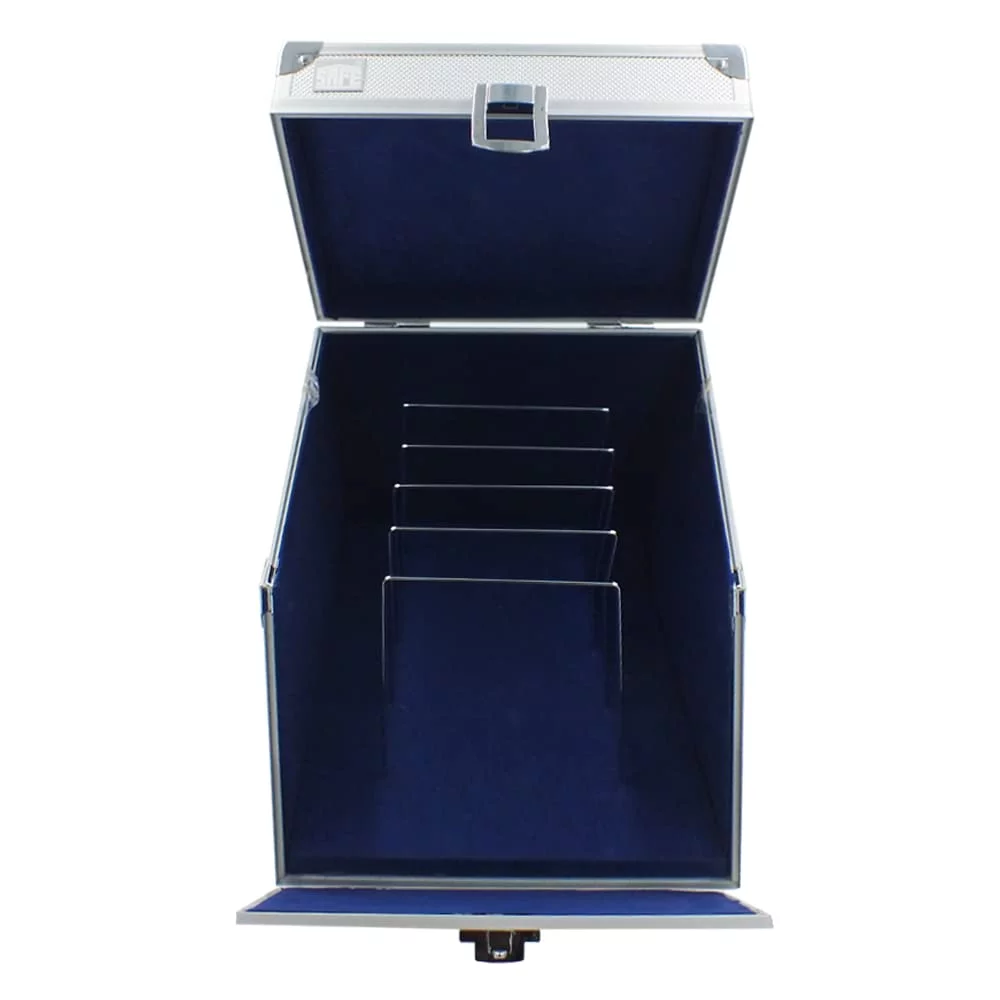 High quality aluminum coin case which has a blue lining on the inside. The case is solidly constructed and equipped with steel corner protectors. The top is completely removable.