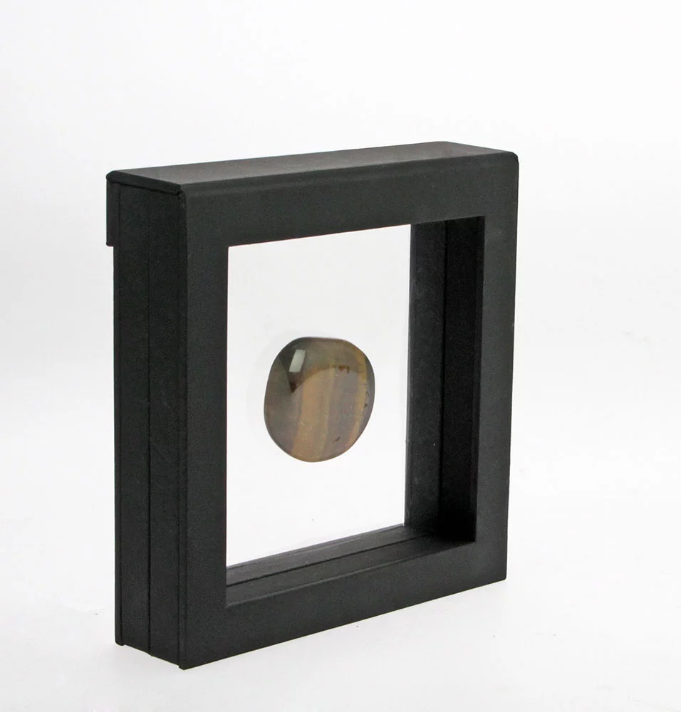 The practical magnetic clip closure allows the frame to be fully opened and closed like a book. The collectible can be taken out at any time to exchange it for another collectible. It is placed on one of the two silicone membrane sheets and the frame is then closed. The object is now enclosed by both silicone membrane sheets and remains in place. The two halves of the frame are held firmly together by a magnetic clasp.