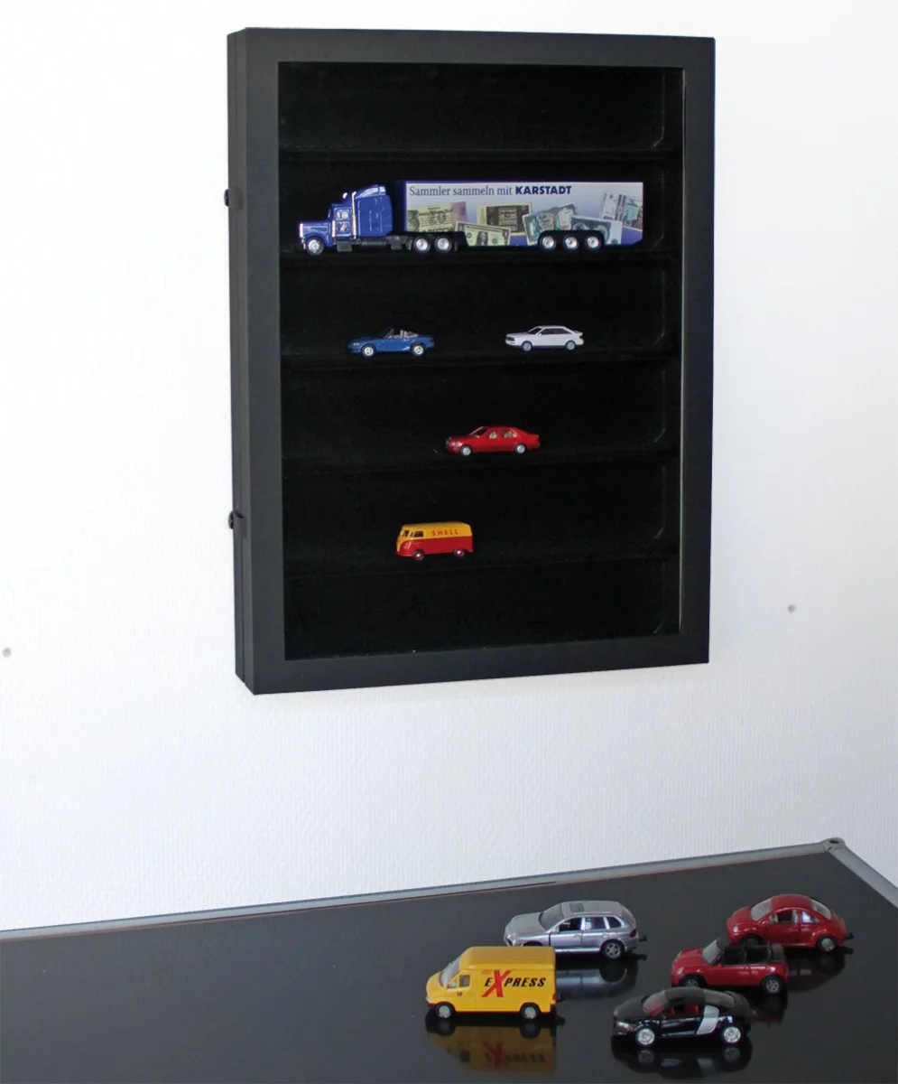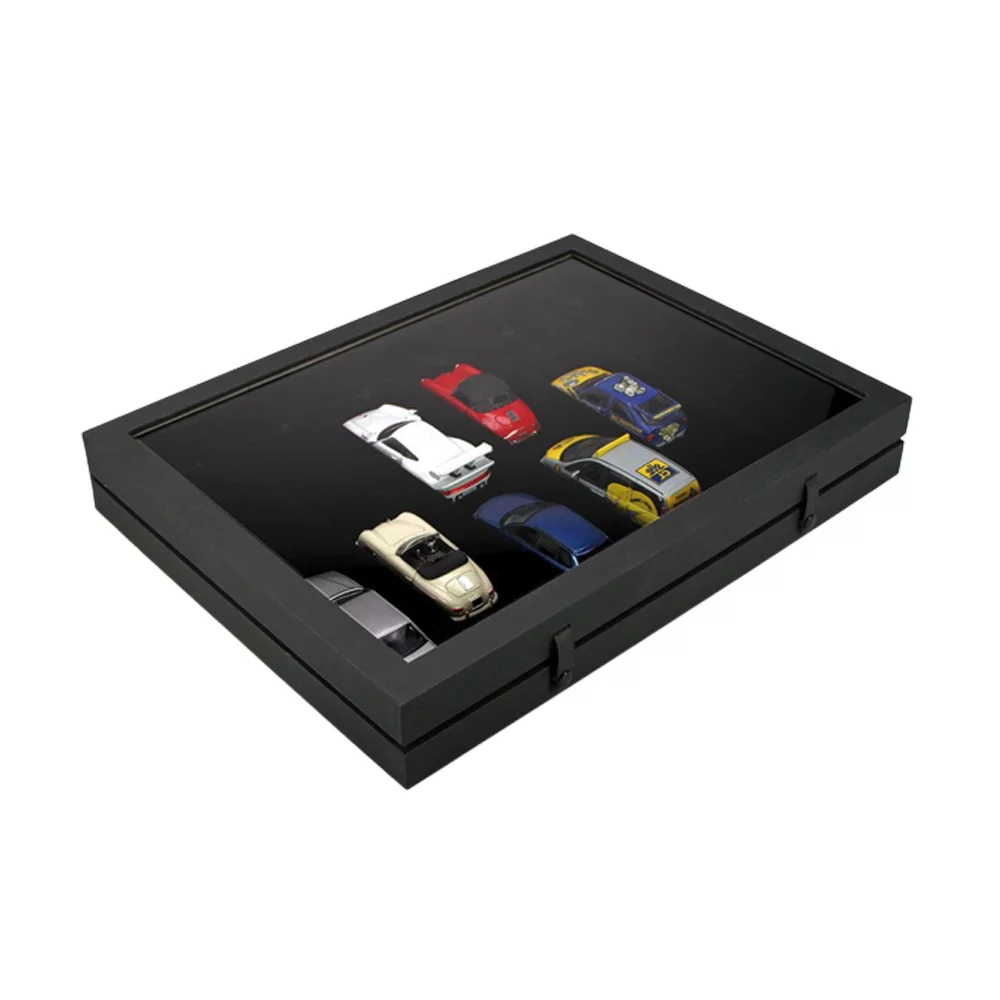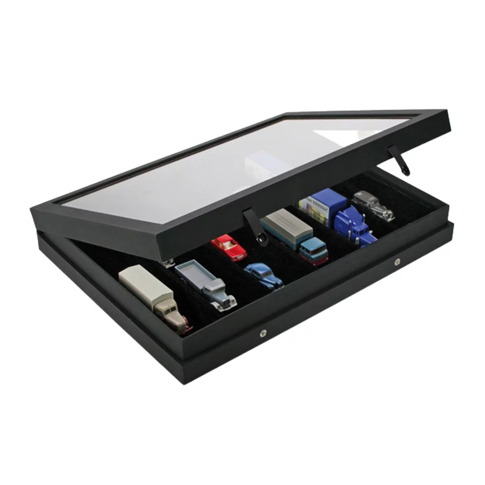 Timelessly elegant presentation display with glass lid. Sturdy display case with a matte black linen textured surface and 2 practical push-button closures.