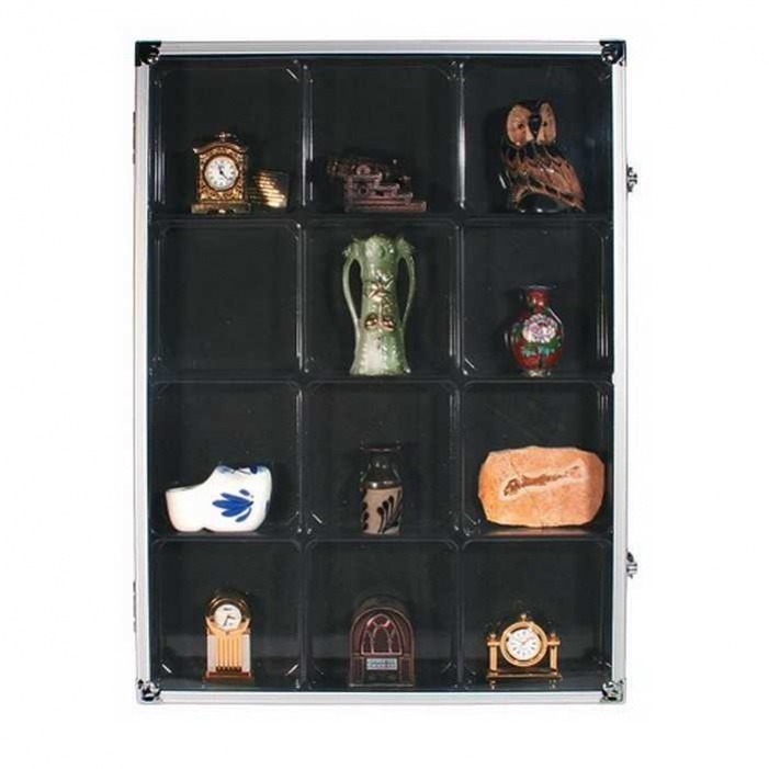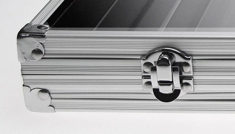 This sturdy aluminum display case comes blue velvet interior. Equipped with 2 lockers. Double hinges, opening over 90°. Metal reinforced corners and edges.