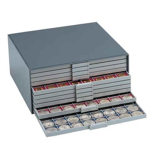 The solid storage system for your coins for more than 50 years!made of impact-resistant plastic polystyrene (PS). The drawer has a total height of 24 mm. you can fill it up to 20 mm. The delivery is without felt inlay or labels, you can order them separately, on the appropriate size for your drawer. The felt is available in blue, red and green.