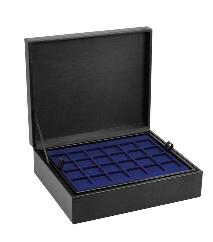 Handmade with precision and high quality - covered with a noble stylish leather fiber fabric (LEFA). The trays for the cassettes have royal blue velour inserts.