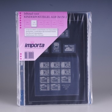 The preprint sheets Children stamps Netherlands by Importa are made of very stable wood-free and aging resistant (250 gr/m2) cardboard in the color Black, equipped with an acid- and plasticizer with anti-reflection mount strips. The sheets in the format 237 x 315 mm, are equipped with a transparent protective cover (acid and plasticizer free) with 4 holes.