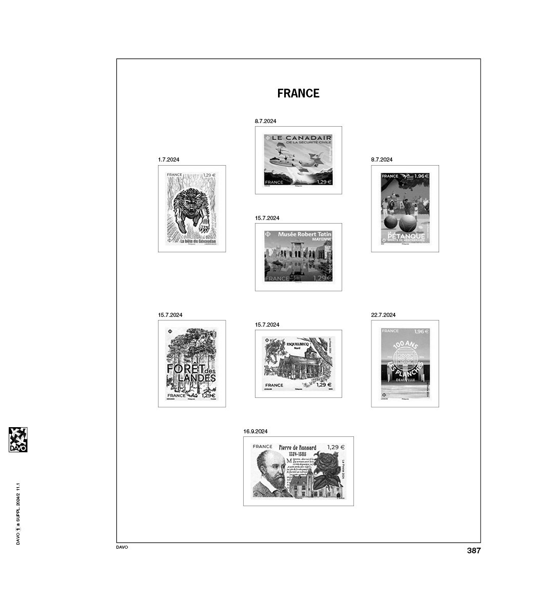 With a size of 275 x 310 mm and a 2 Holes perforation, these pre-printed sheets fit perfectly in the corresponding 2024 albums Each sheet is equipped with black border lines and image(s) in Black on sheets in the color White, e.g. stamps, miniature-sheets, stamp booklets, etc. that belong in this pre-printed album sheet. This gives you a clear overview of what you already have and what is still missing. This way, you can keep your collection organized and up to date, sorted by year or period.