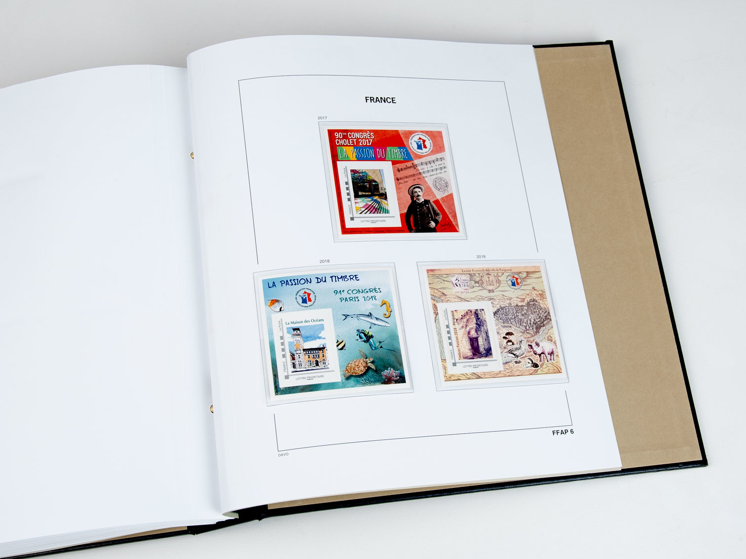 Les suppléments avec feuilles préimprimées de Davo, de type DeLuxe, sont fabriquées en carton particulièrement solide, sans bois et résistant au vieillissement d'un poids de 170 gr/m2. Ces feuilles de haute qualité sont de couleur Blanc et sont pourvues de bandes à pochettes transparentes sans acide ni plastifiant protègent vos timbres, carnets de timbres, feuillets, etc. de manière optimale contre les influences extérieures, sans gêner la vue sur votre collection.