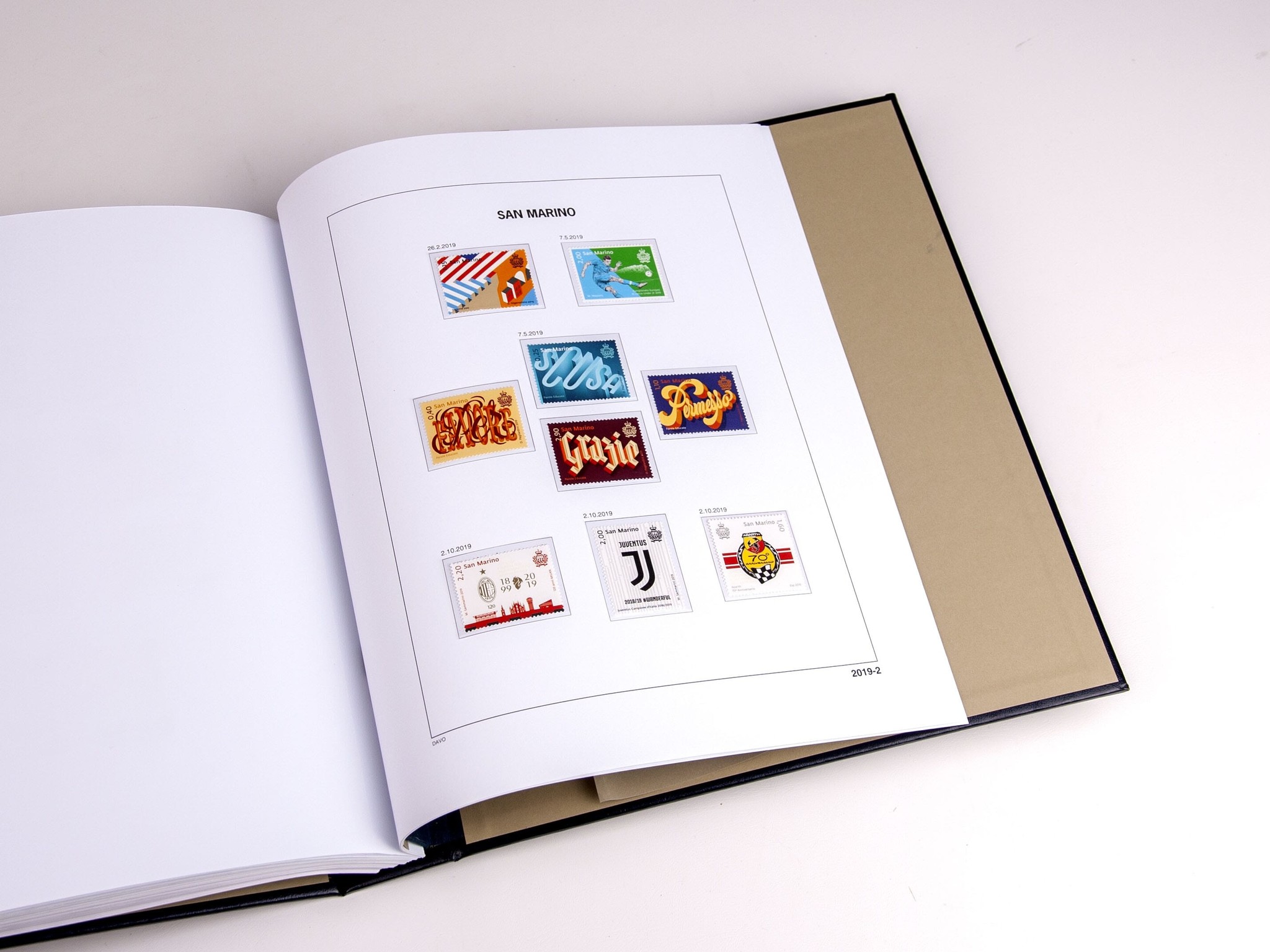 Chaque année paraît le supplément Saint-Marin, qui contient des feuilles de papier extra lourd (170 grs.) avec des bandes à pinces sans plastifiant.