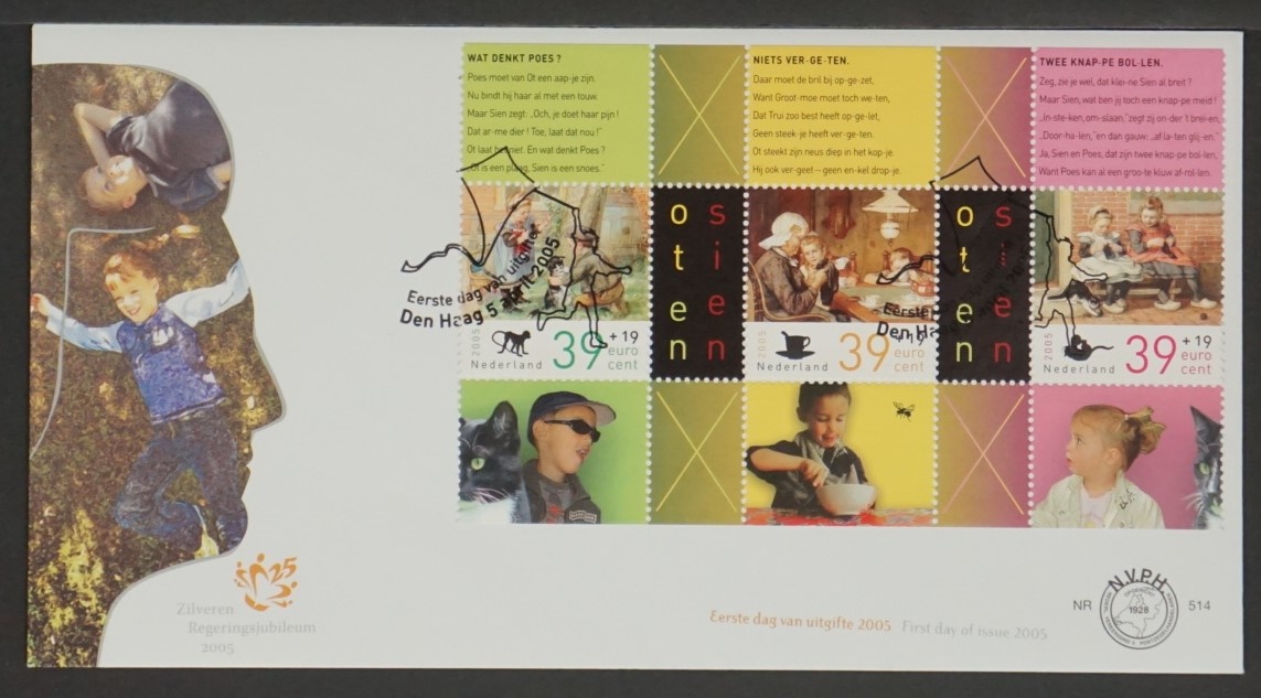 Néerlandais Les enveloppes premier jour (FDC) associent un timbre-poste à une oblitération officielle du premier jour sur une enveloppe assortie. Elles marquent le moment d’émission et constituent un objet de collection reconnaissable en philatélie moderne, la date et le lieu d’oblitération remplissant une fonction documentaire précise.