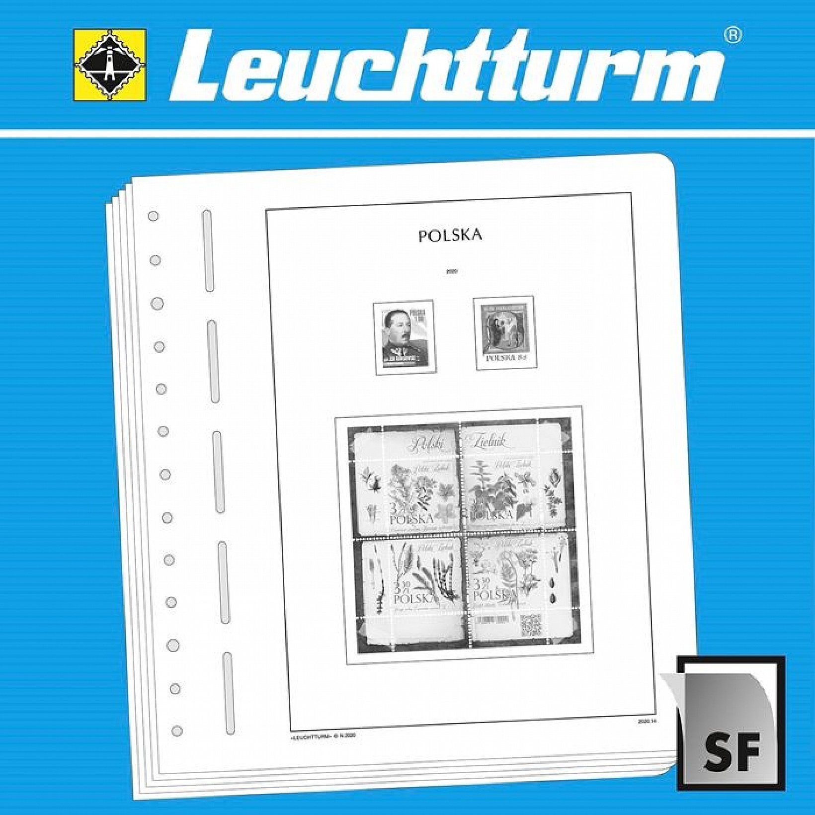 Chaque année paraît le Pologne, ce qui constitue les feuilles de l'album de pré-impression Leuchtturm. Les feuilles ont bandes à pinces et une perforation de 13 anneaux pour les reliures à anneaux Leuchtturm.