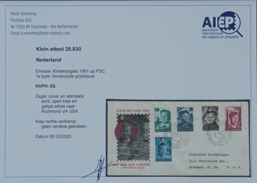 NVPH - , Couverture Premier Jour (Pays-Bas), Émis de l'année: 1951, Adressée (A) - Certificat d’expertise - Rabat ouvert (OF)