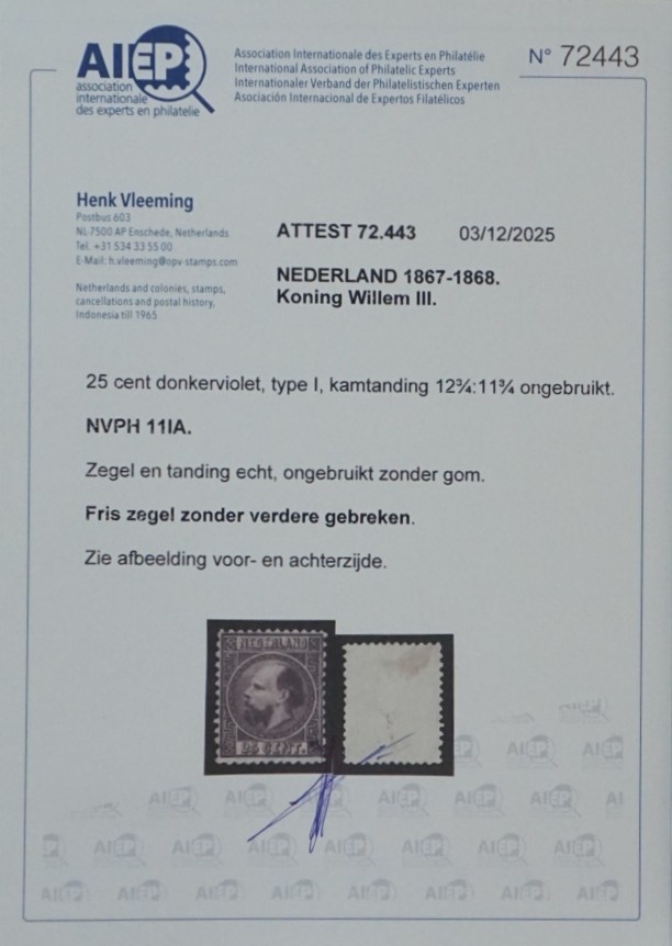 NVPH - 11 IA, Timbre (Pays-Bas), Émis dans les années: 1867-1868, Neuf sans gomme (MNG) - Attestation
