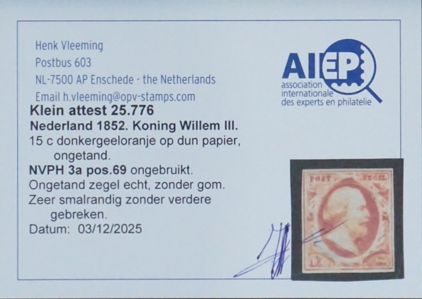 NVPH - 3a, Timbre (Pays-Bas), Émis de l'année: 1852, Neuf sans gomme (MNG) - Attestation -