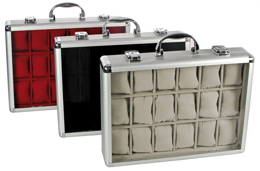 Élégante mallette en aluminium renforcée par des coins et des bords en métal et un couvercle en verre acrylique cristallin. L'intérieur de cette vitrine est tapissé de velours et comprend 18 coussinets amovibles pour fixer les montres ou autres bijoux. Fabriquée avec du matériel de haute qualité et dotée de doubles charnières. Se ferme à l'aide de deux serrures à tension.