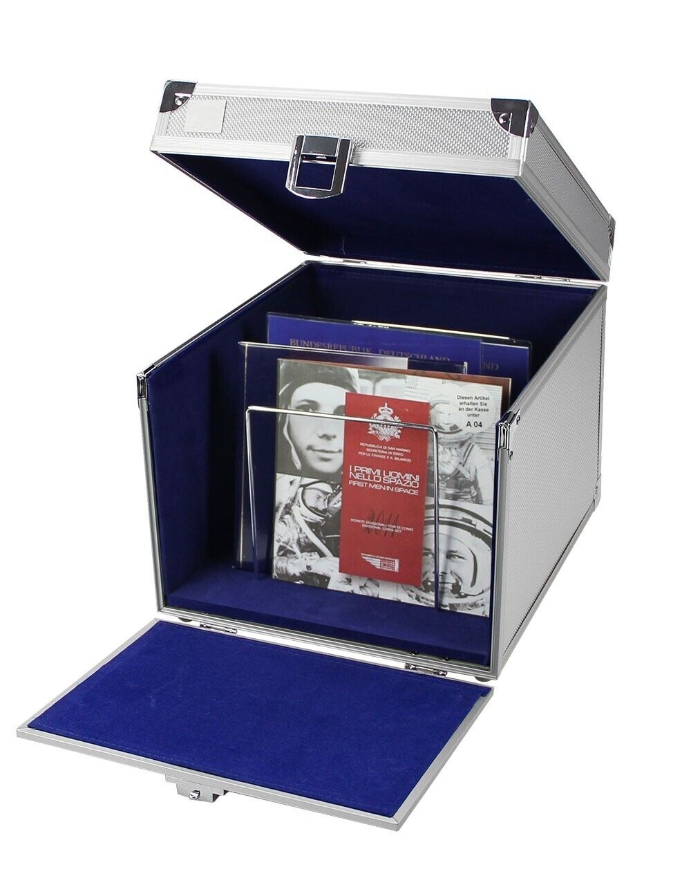 Coffret à monnaie en aluminium de haute qualité avec une doublure bleue à l'intérieur. L'étui est solidement construit et équipé de protections de coins en acier. Le couvercle est entièrement amovible.