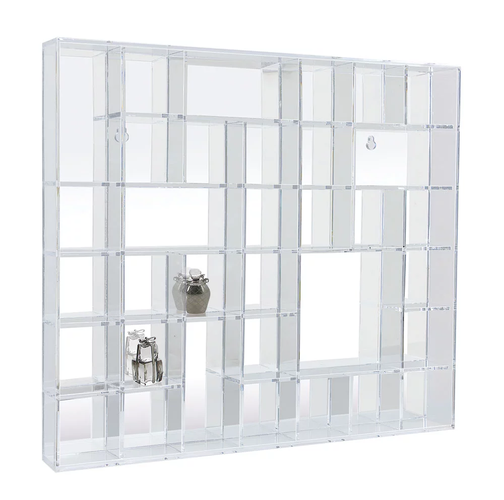Vitrine en verre acrylique avec 34 compartiments, Équipé d'une paroi arrière en miroir.