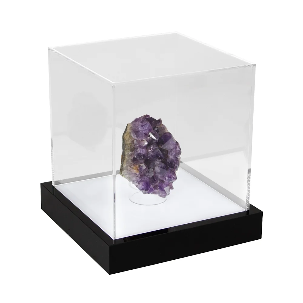 Le socle intègre un éclairage LED économe en énergie, composé de plusieurs LED assurant une diffusion lumineuse homogène et élégante. L’objet présenté est éclairé sur tous les côtés, parfaitement mis en valeur et protégé de manière optimale.