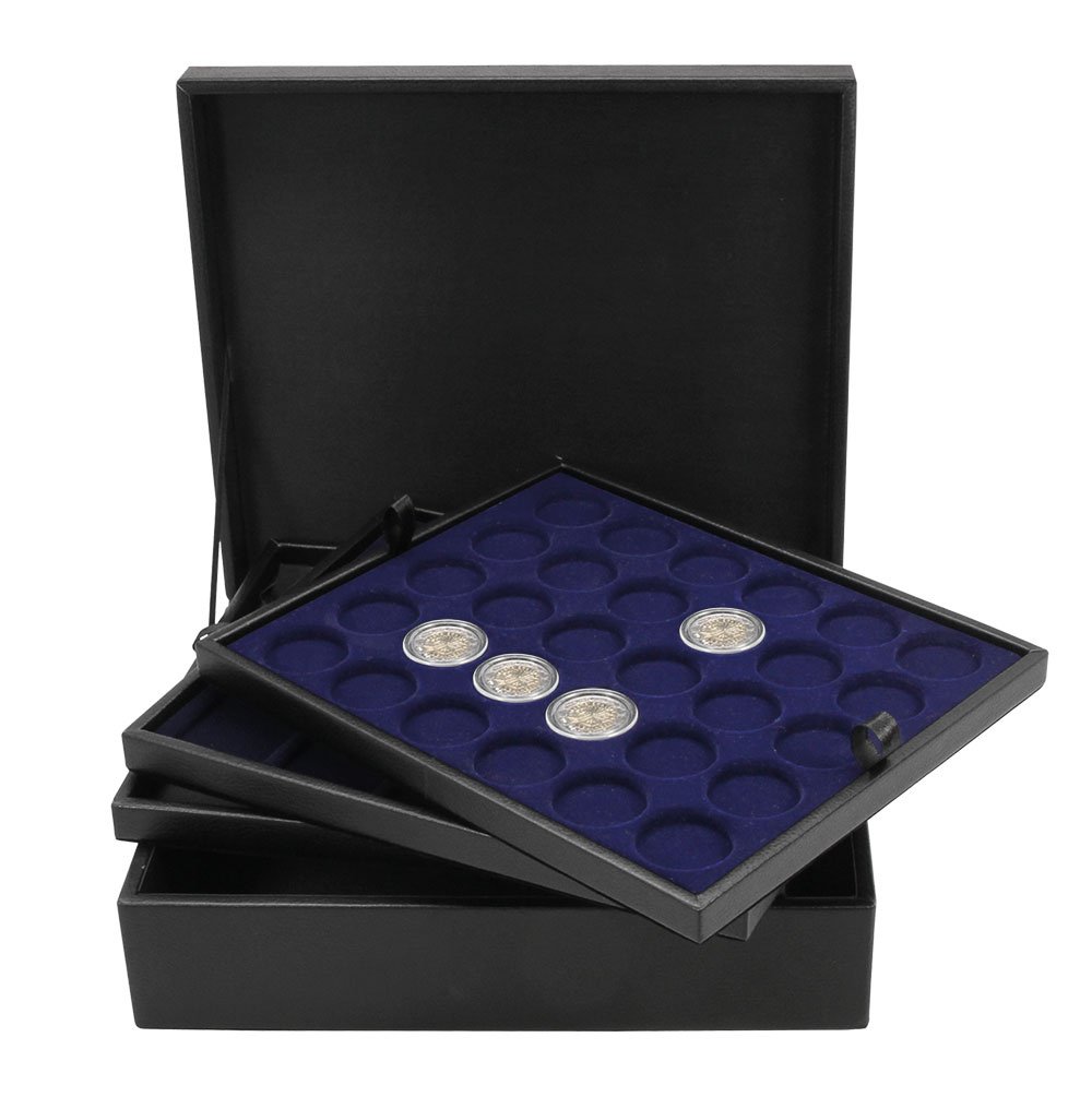 Fabriqué à la main avec précision et de haute qualité - recouvert d'un tissu en fibres de cuir noble et élégant (LEFA). Les plateaux pour les cassettes ont des inserts en velours bleu royal.